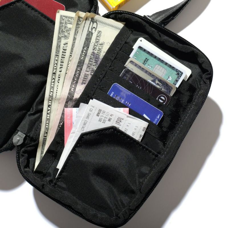 前部はお札・カード・パスポートなどを整理できる財布機能付きポケット。